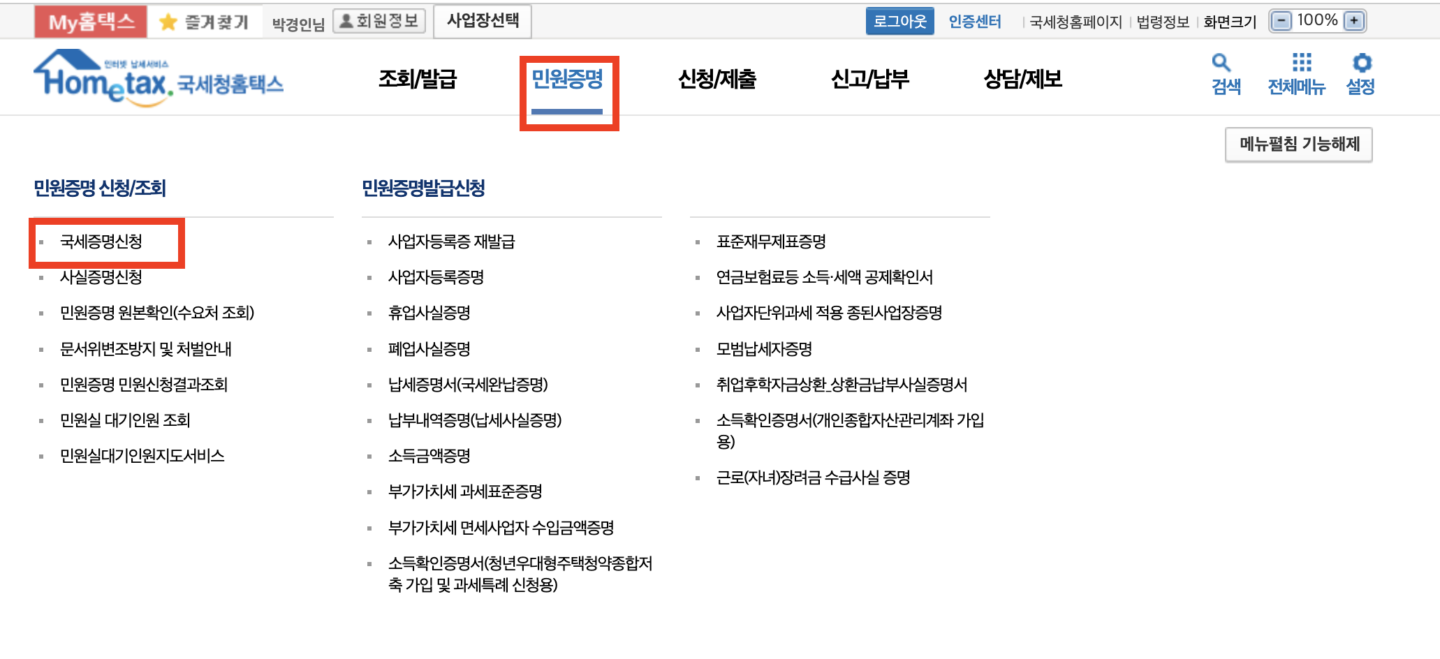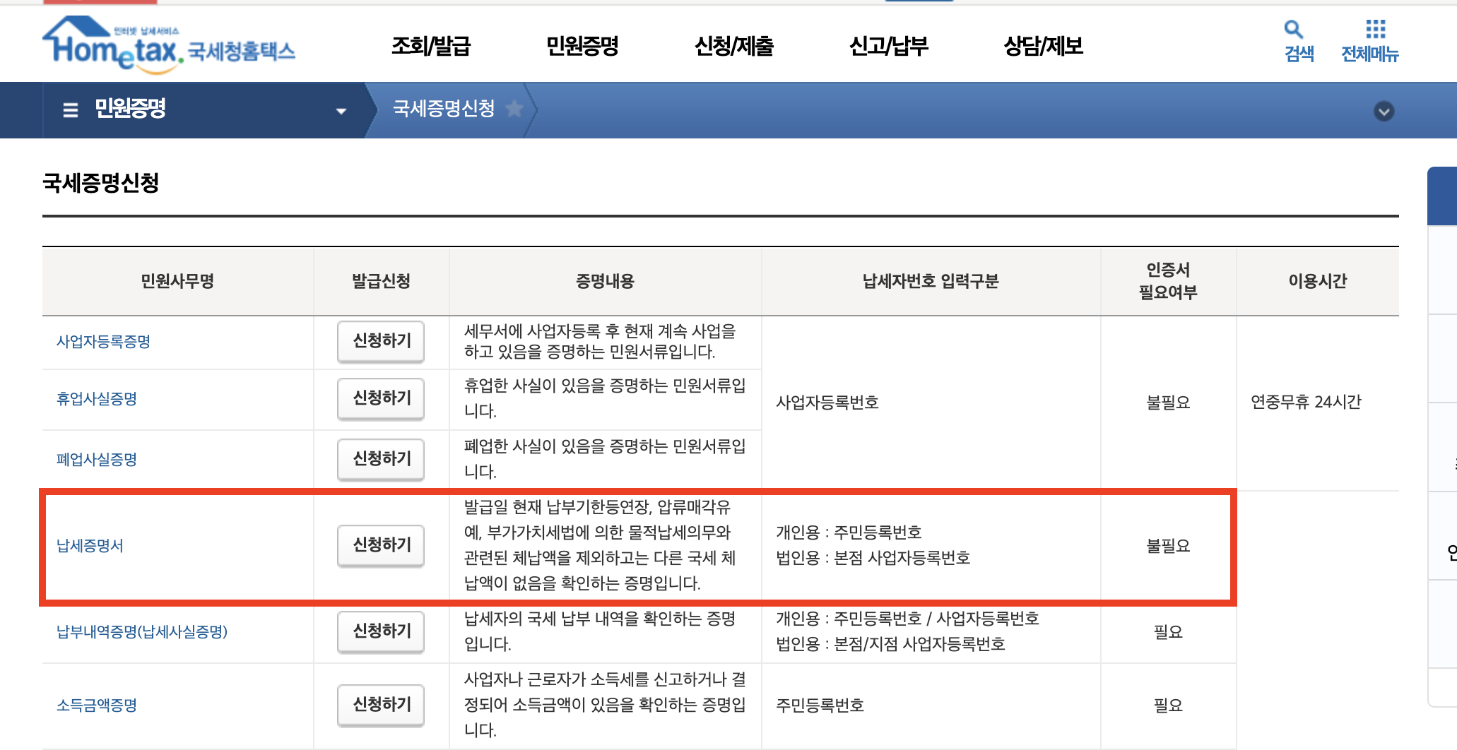 로그인 후 상단 메뉴 [민원증명] - [국세증명신청]을 누른 후 [납세증명서]를 클릭합니다.