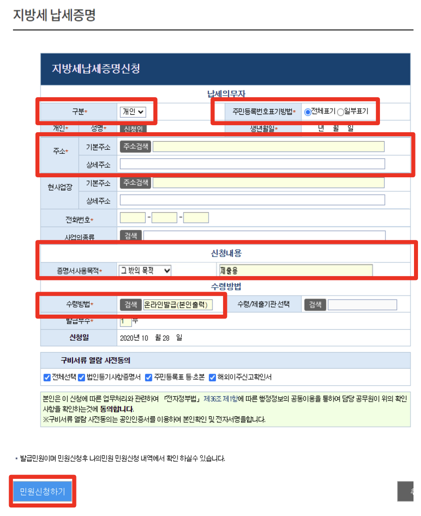 개인 정보 확인하신 후 아래 그림과 같이 주소와 주민등록번호를 공개로 해주셔야 합니다.