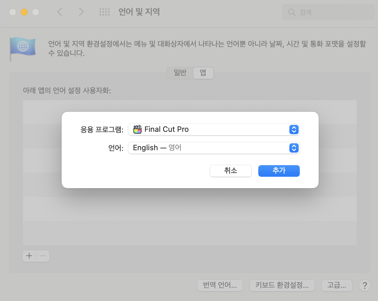 응용프로그램으로 파이널 컷 프로를 선택한 후 언어를 English로 변경합니다.
