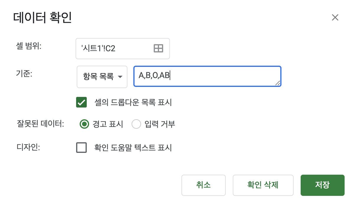 '기준'에서 '항목 목록'을 선택한 후 아래 그림과 같이 'A,B,O,AB'를 입력합니다.