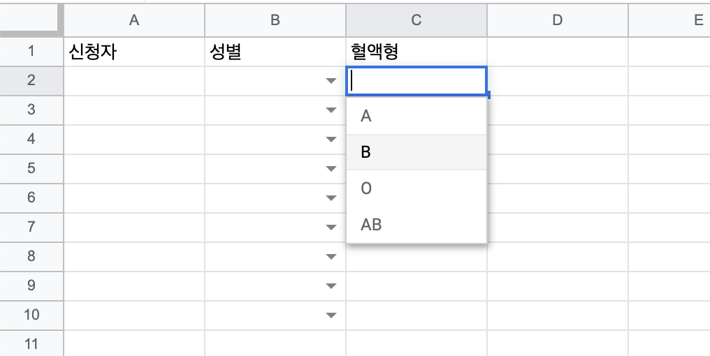 C2셀에 드롭다운이 추가되었고 클릭하면 A, B, O, AB 중에서 선택할 수 있게 되었습니다.