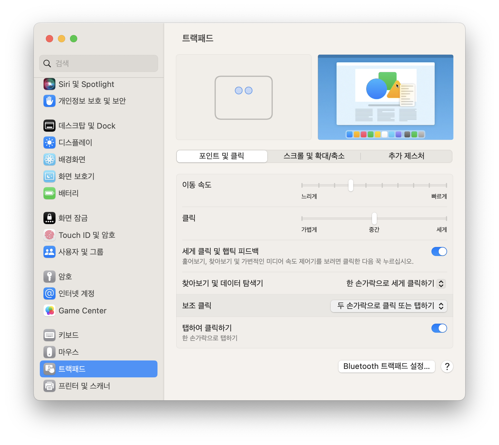 트랙패드 설정 창에서 [포인트 및 클릭] - [보조 클릭]을 체크하면 두 손가락으로 클릭을 하게 되면