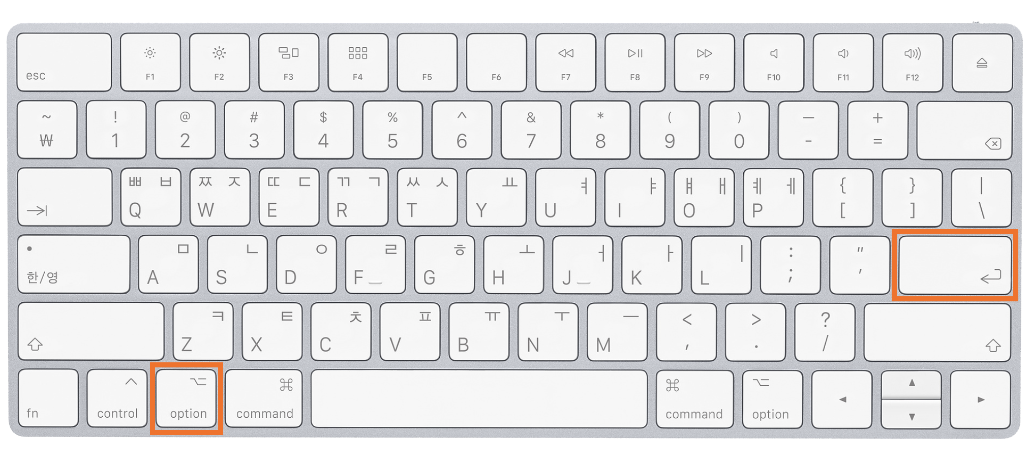 글자를 입력한 후에 'option + return' 키를 누릅니다.