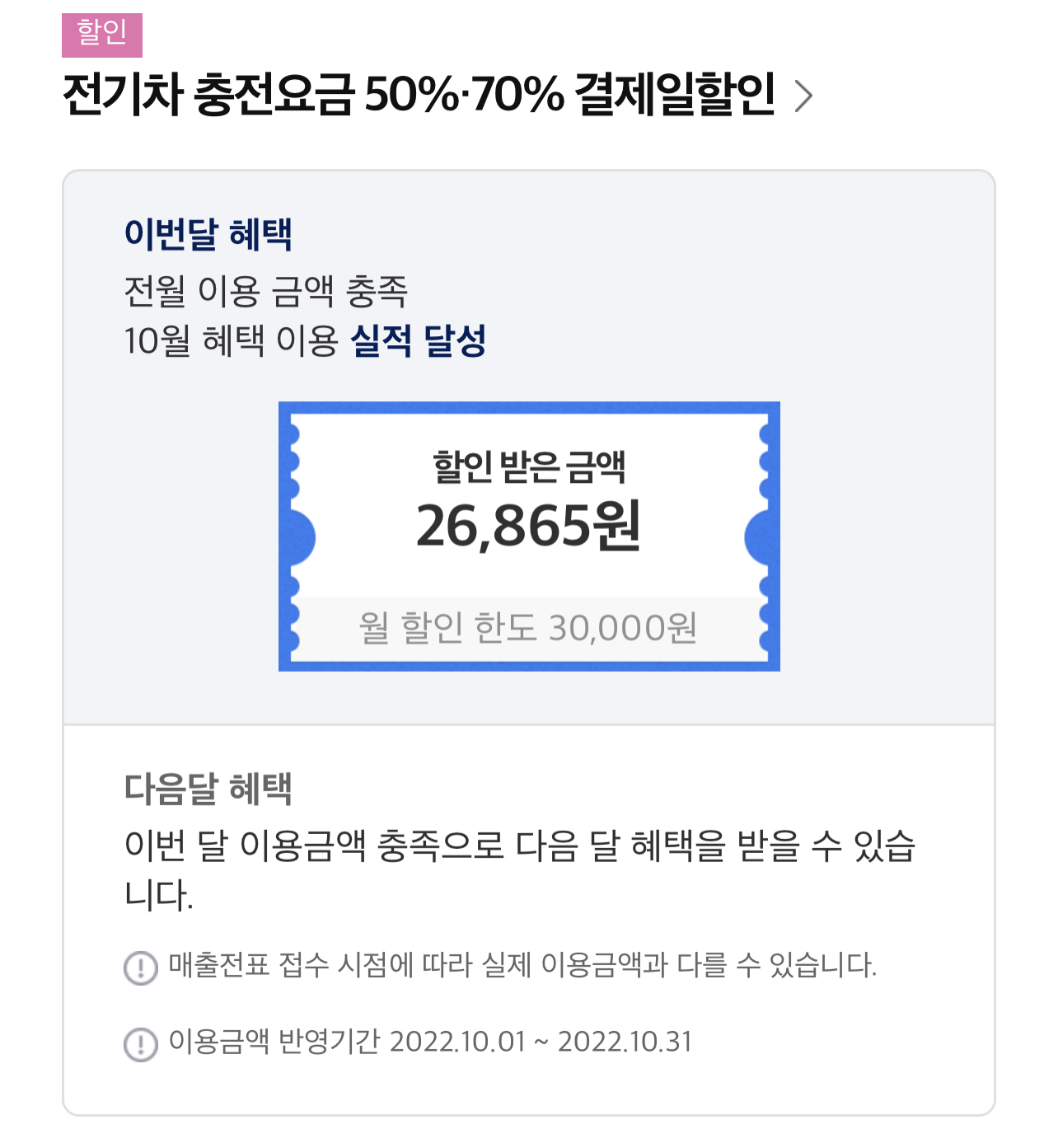 전월 실적이 30만원 이상이면 전기차 충전 금액 결제 할 때 50% 할인을 받을 수 있습니다.