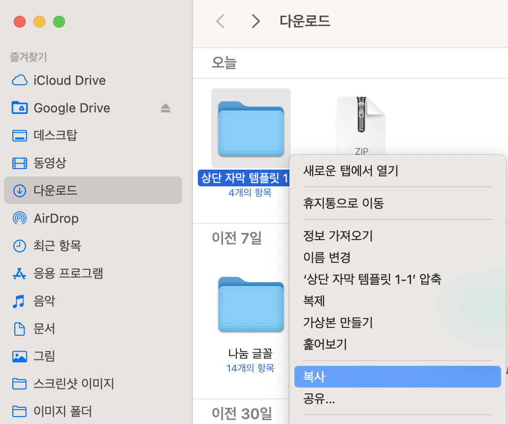 - 폴더 복사: 압축을 풀면 생성된 폴더를 통째로 복사합니다.