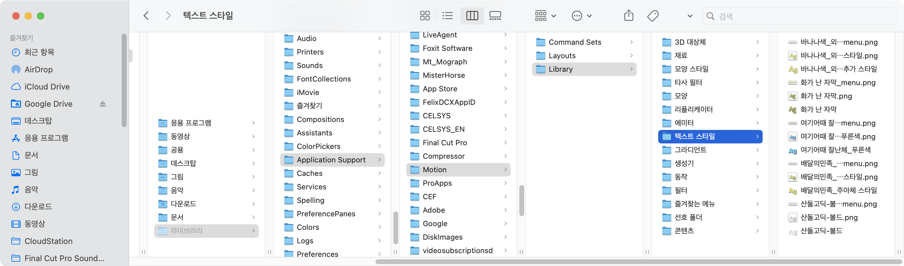경로를 아래 그림과 같이 [Application Support] - [Motion] - [Library] - [텍스트 스타일] 로 이동하면 됩니다.