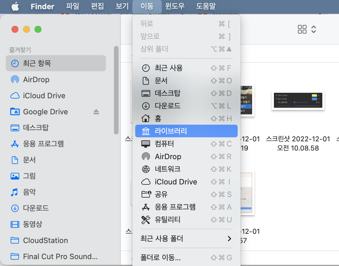 파인더를 실행한 후 상단 메뉴 [이동]을 누른 후 option 키를 눌러봅니다.
