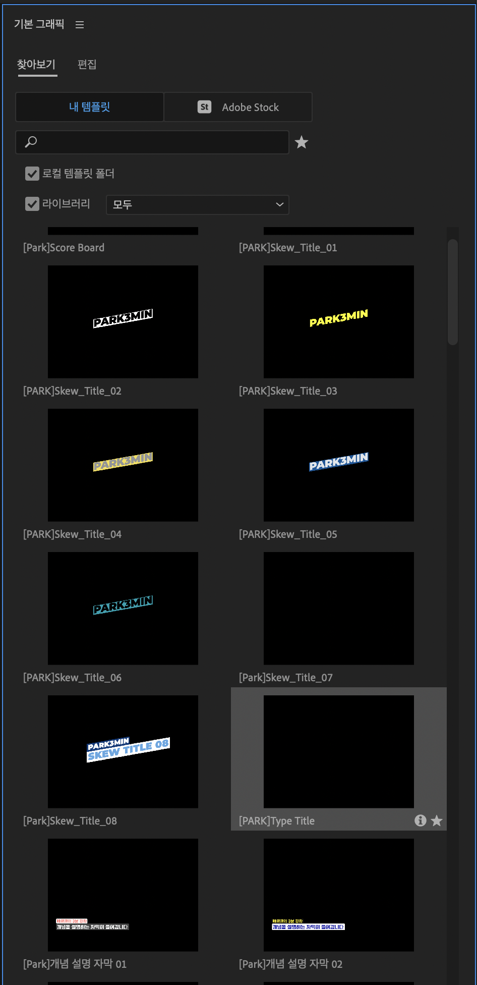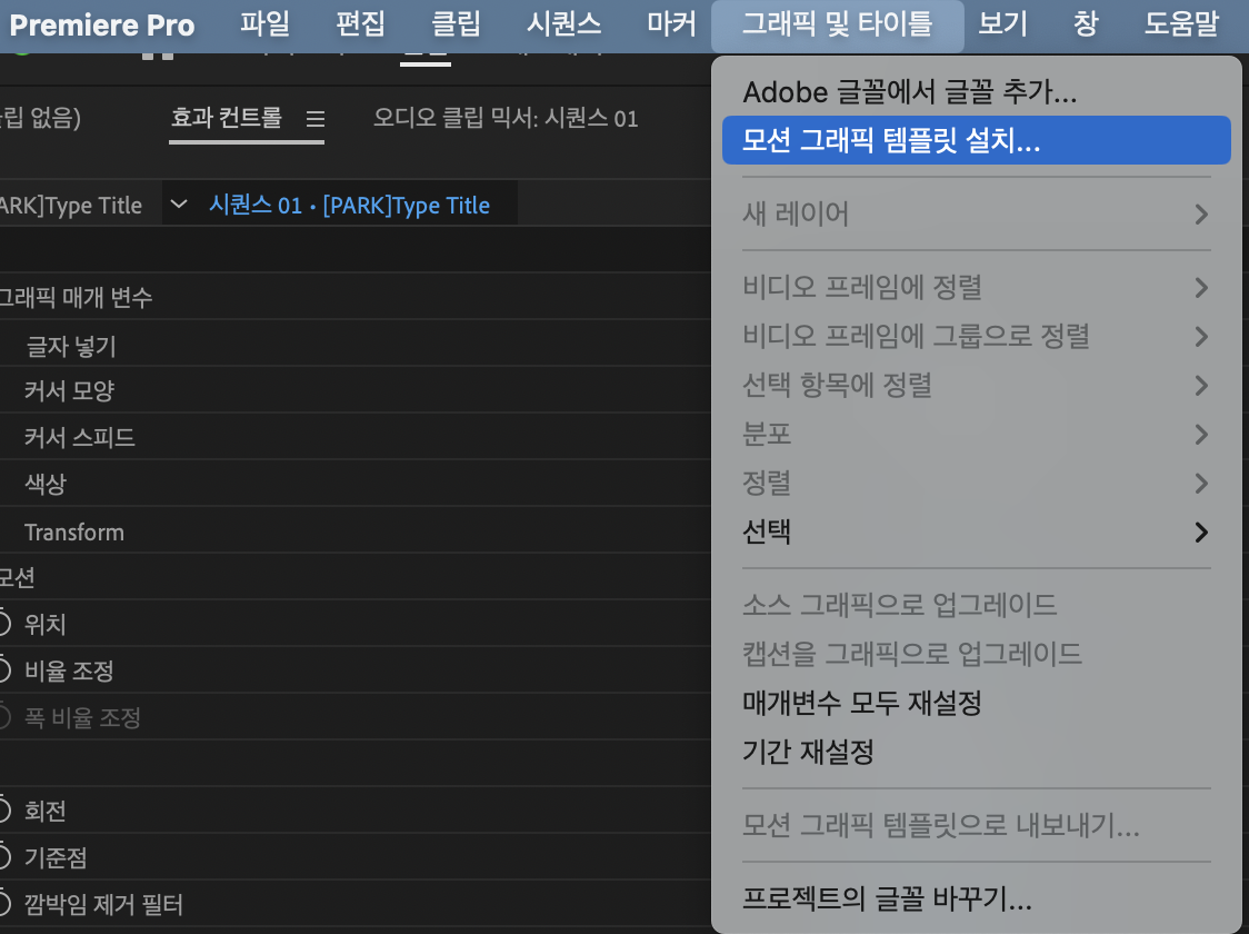 설치를 하시고 난 후 기본 그래픽 패널에 [Park]Type Title 이란 제목으로 있습니다. 타임라인으로 배치하여 사용하면 됩니다.