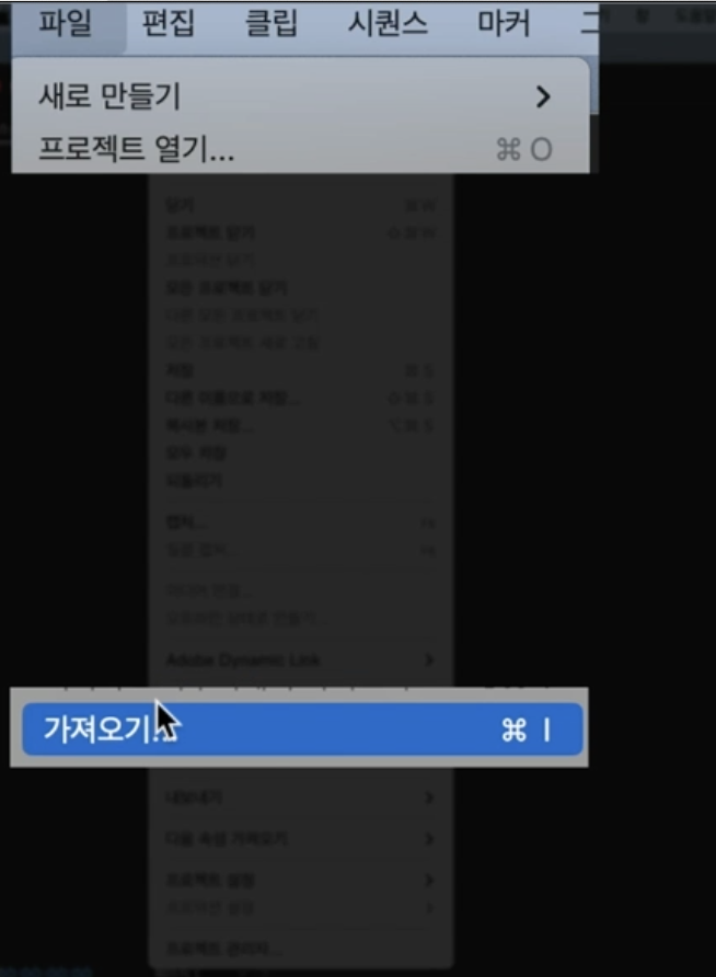 혹은 프로젝트 패널에서 여백 부분을 마우스 우클릭 한 후에 [가져오기]를 실행할 수 있습니다.