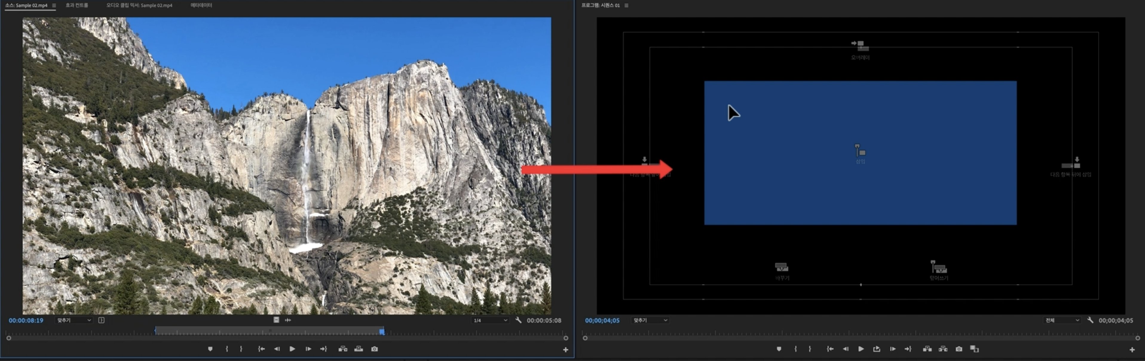 그림에서는 소스모니터에서 프로그램 모니터로 드래그 앤드 드롭하였습니다.