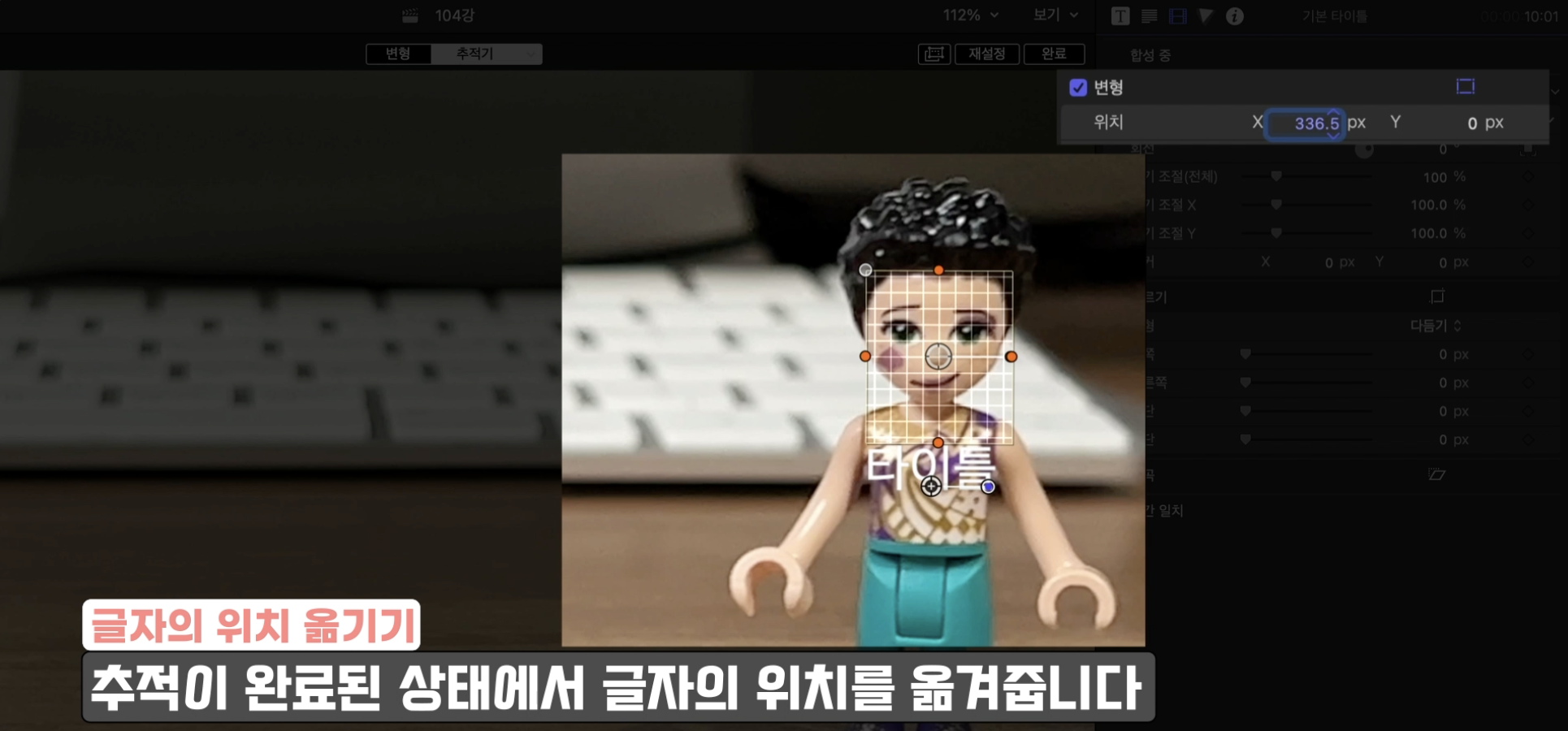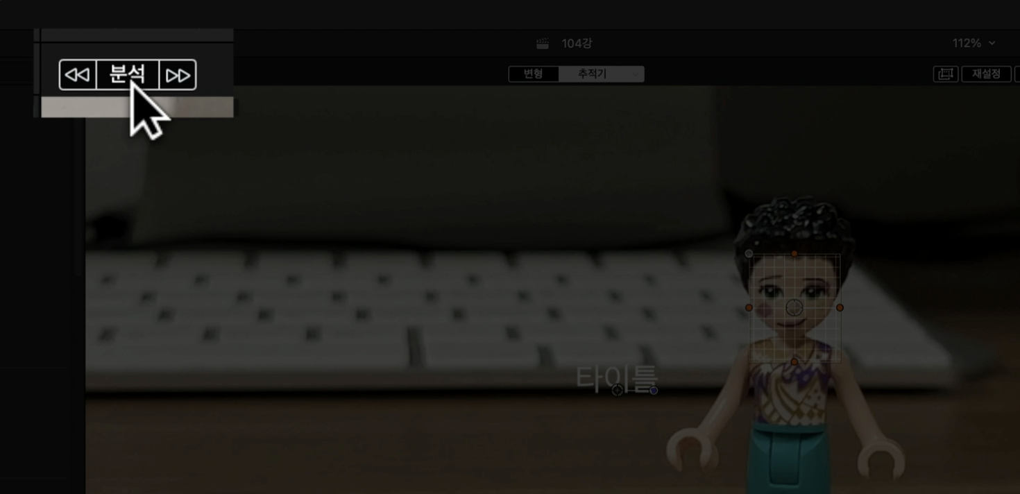 애플스토어 명동 매장에서 파이널컷 프로를 실행해보며 다양한 데모들을 살펴봤습니다. 특히 모델의 얼굴을 추적해 타이틀을 연결하는 오브젝트 트래킹 기능이 매우 흥미로웠습니다. 저는 이 기능을 활용해, 아이가 가지고 노는 레고를 중심으로 영상을 만들어봤습니다. 이 방법으로 카메라가 패닝(좌-우로 움직이는)하면서 프레임 바깥에 있던 사물이나 인물이 등장할 때 자연스럽게 타이틀을 연결하는 오프닝 영상을 제작할 수 있었습니다.
