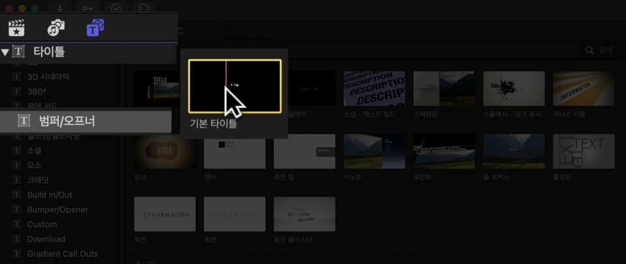 파이널컷 프로의 기본 타이틀은 [타이틀] 메뉴 아래의 [범퍼/오프너] 카테고리에서 찾을 수 있습니다. 많은 분들이 기본 타이틀이 어디 있는지 헷갈릴 수 있는데, [범퍼/오프너] 카테고리를 꼭 기억해주세요.