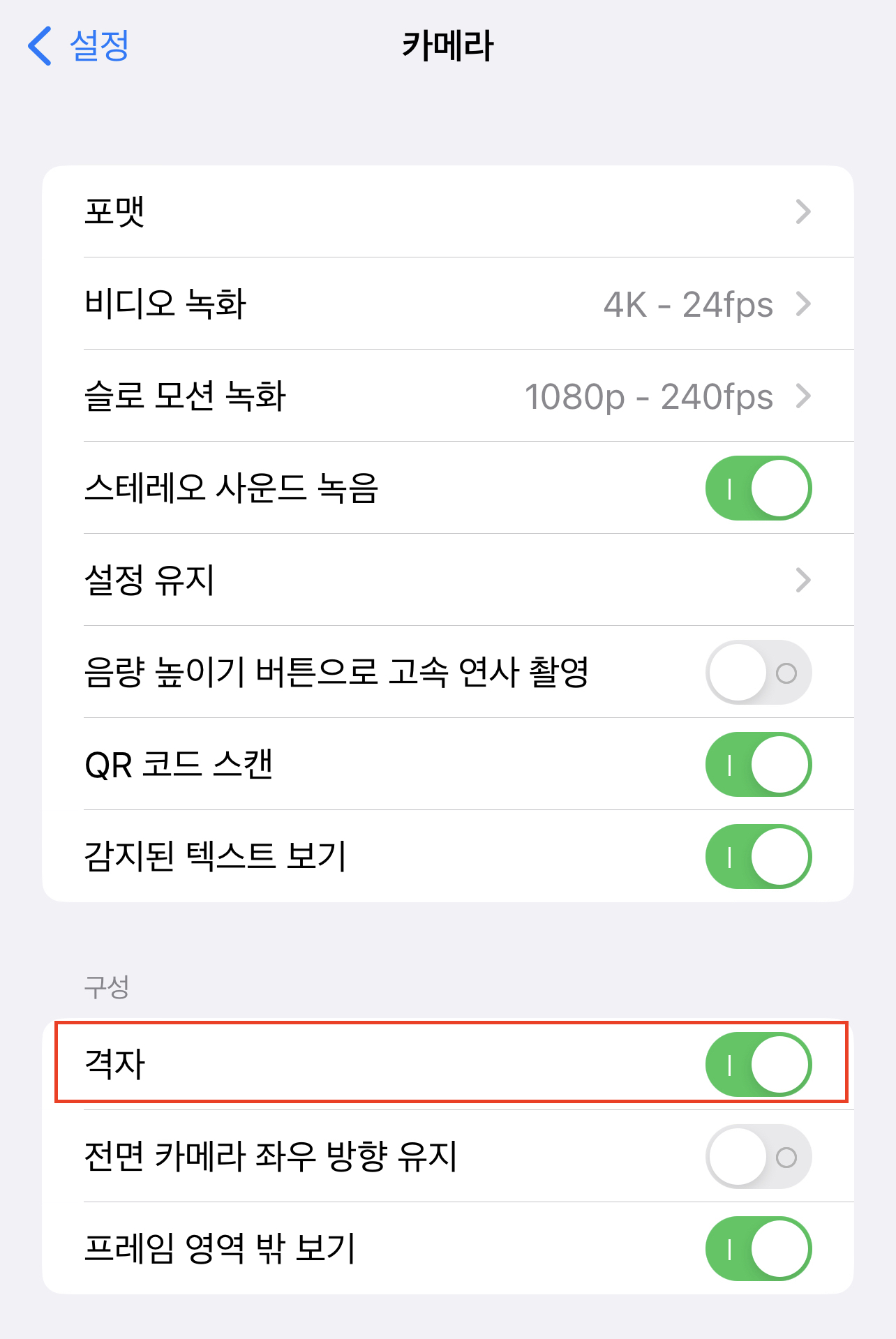 그리드 기능을 활성화하는 방법은 매우 간단합니다. [설정]을 실행한 후 카메라 아이콘을 누르고, 격자 옵션을 켜주시면 됩니다.