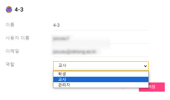 소유자 계정에서 사람 관리를 통해 조직원에게 부여할 수 있는 권한은 3가지 '관리자', '학생' , '교사' 가 있습니다.