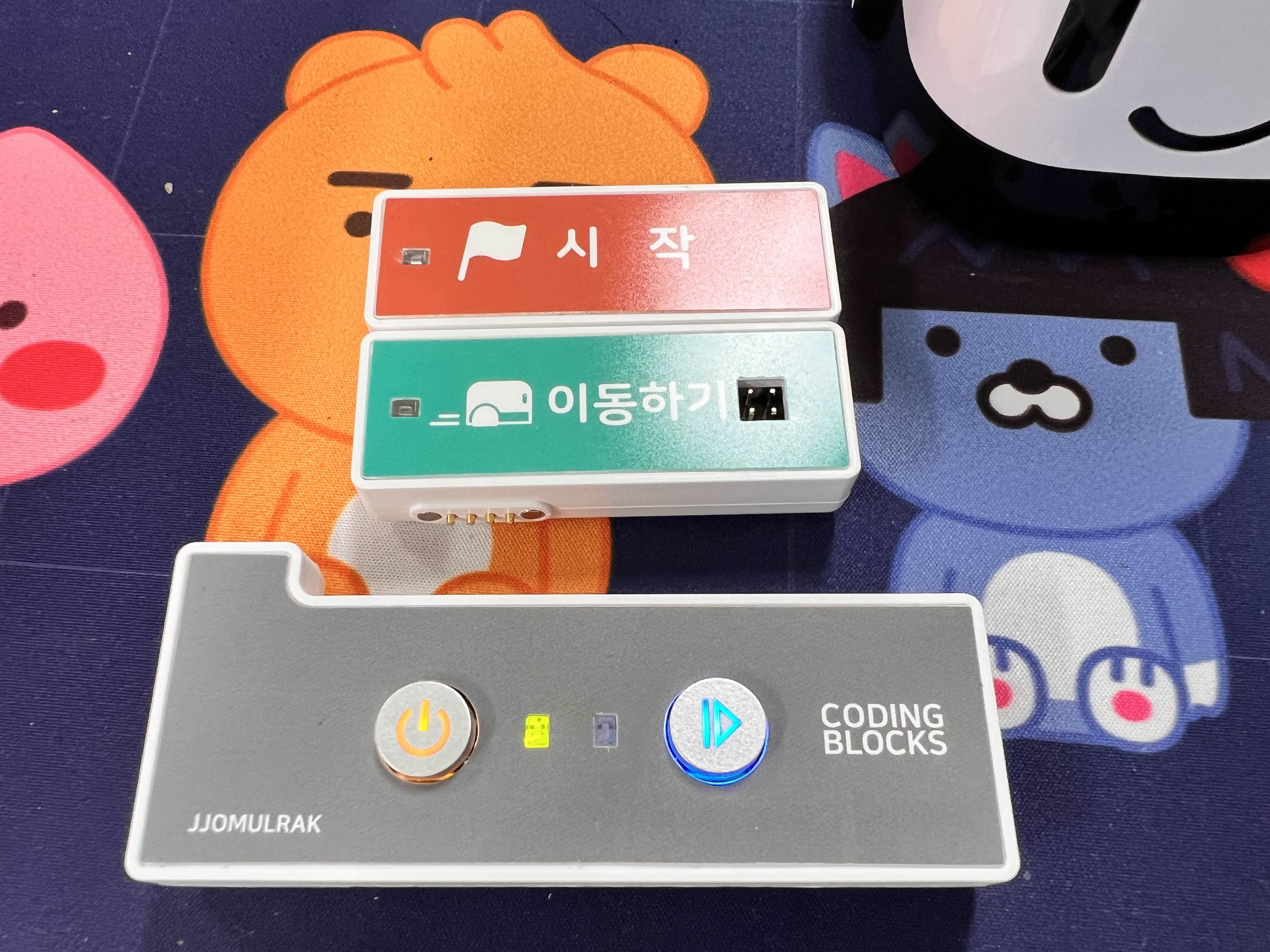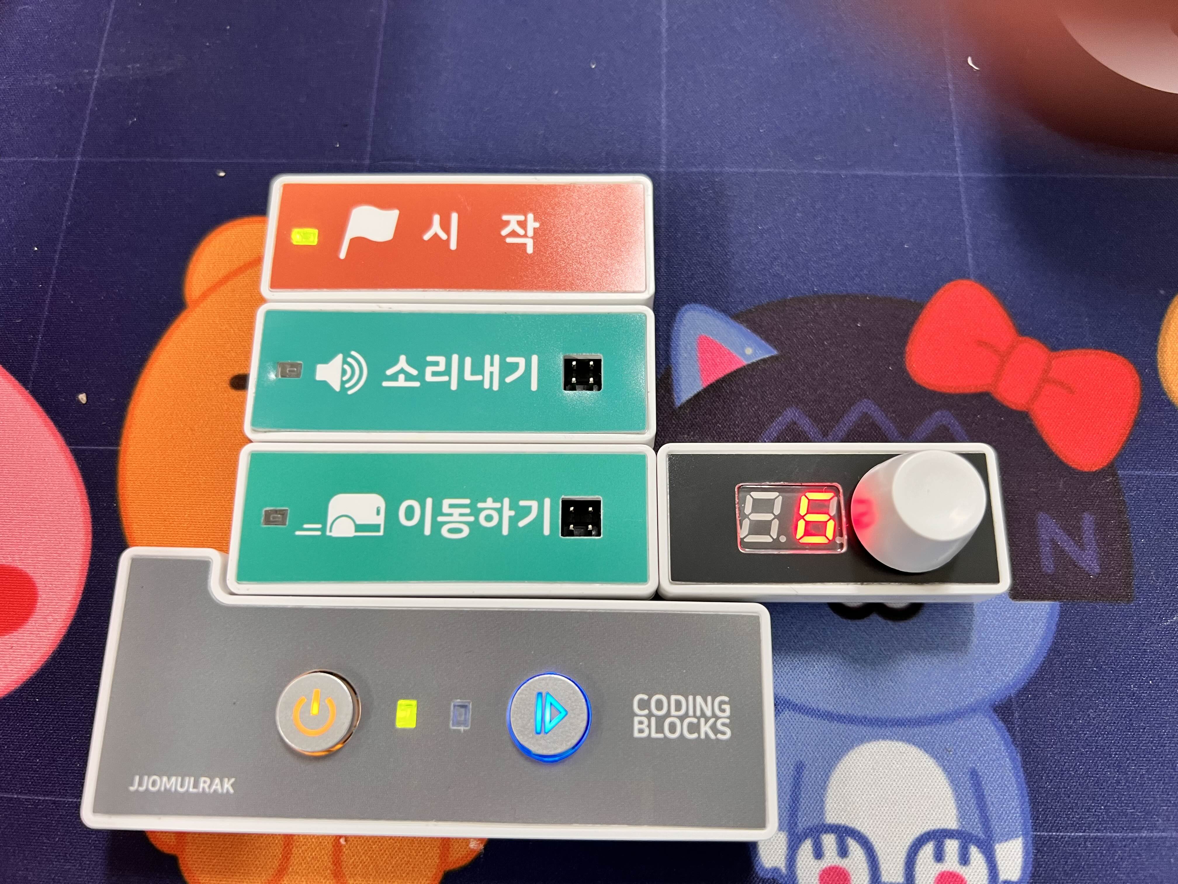 코딩블록을 조립하여 브레인 블록(조정기)에 부착시키면 됩니다. 아 이래서 정말 컴퓨터 없이도 블록코딩 교육을 할 수 있구나!