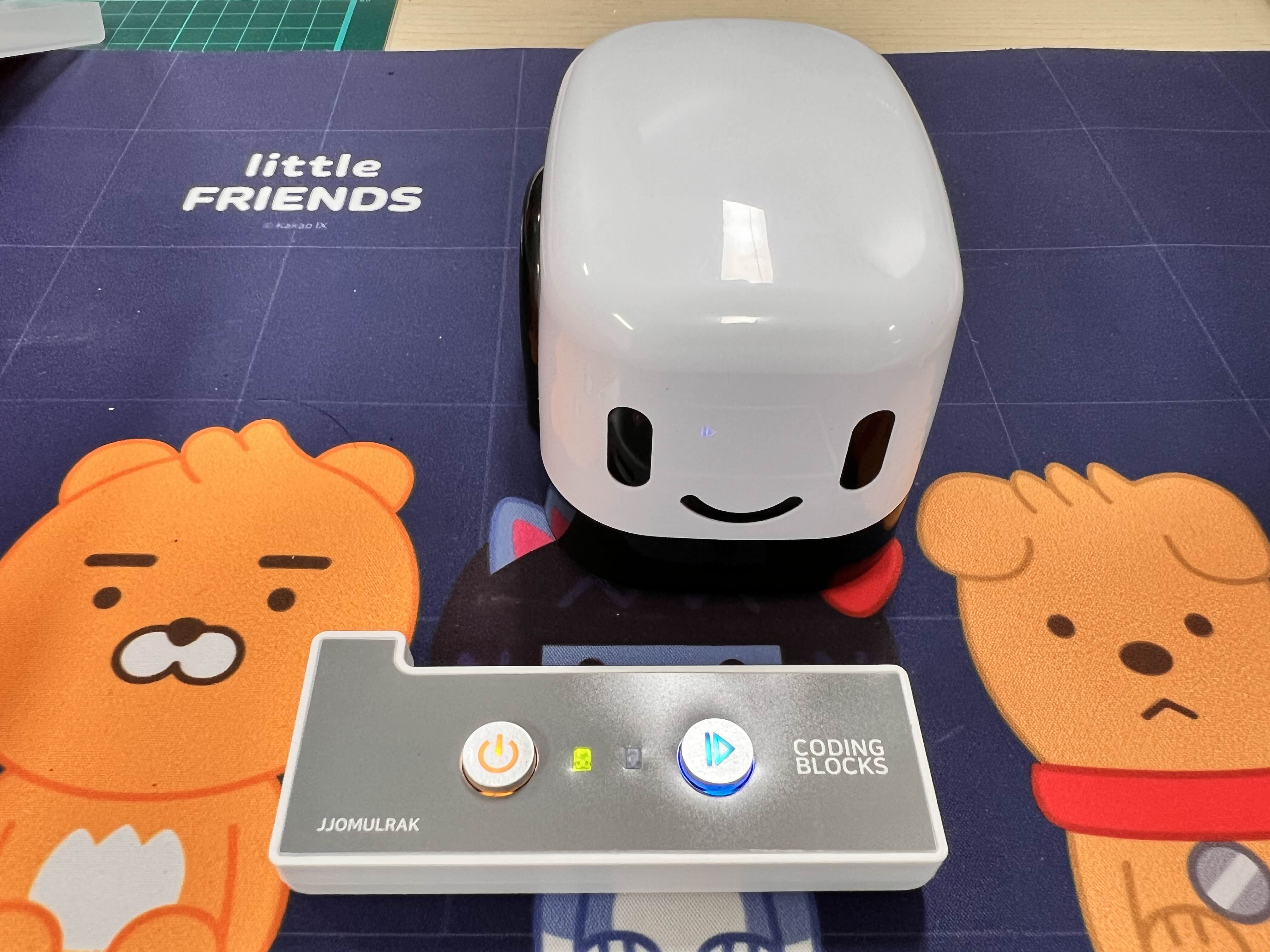 코딩 로봇과 브레인 블록(조정기)을 페어링 하는 작업은 정말 간단했습니다. 로봇 밑면에 있는 전원 버튼을 켜고 조정기 역시 파워 버튼을 꾹 누르니까 나머진 알아서 페어링이 되더라구요.