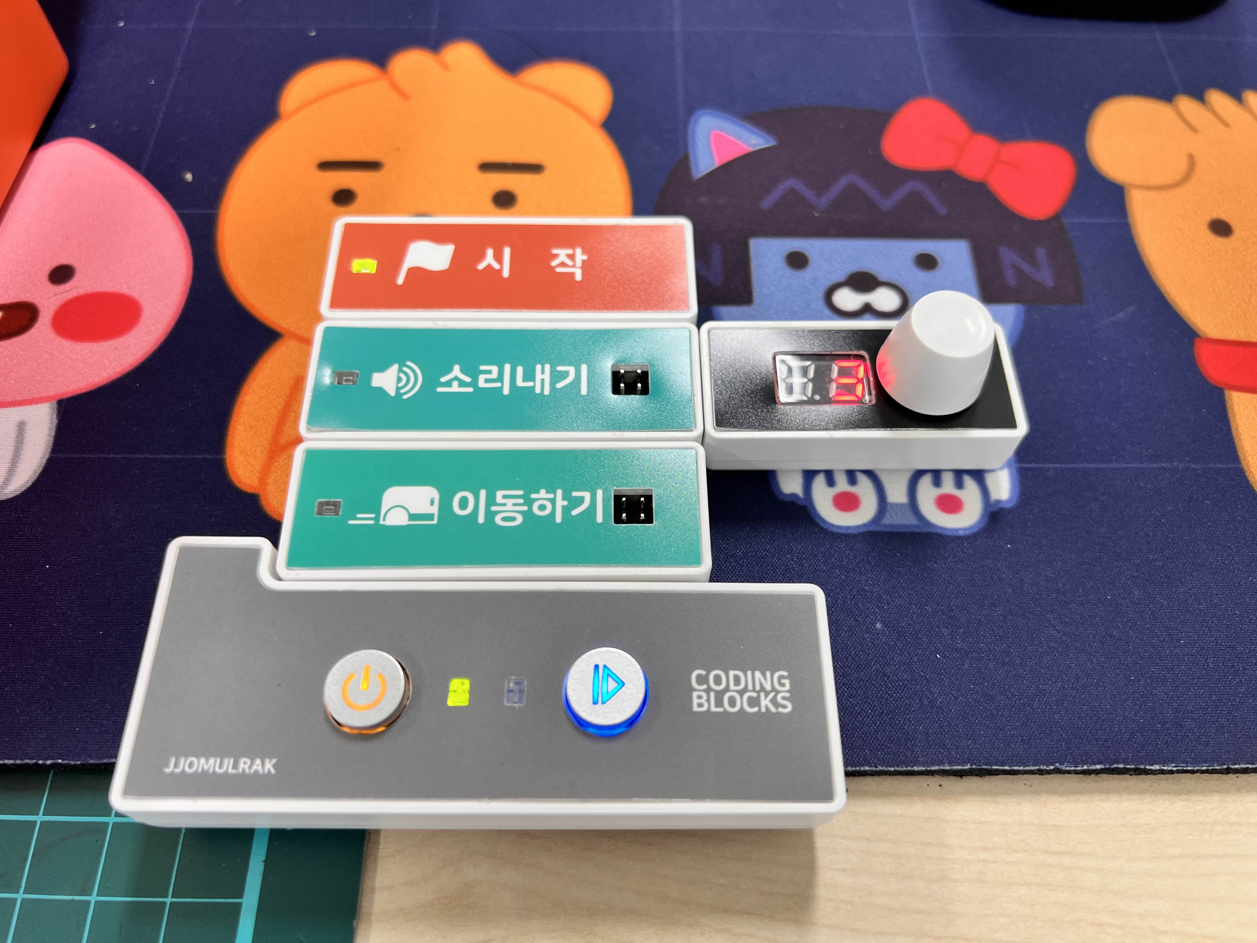 코딩블록을 조립하여 브레인 블록(조정기)에 부착시키면 됩니다. 아 이래서 정말 컴퓨터 없이도 블록코딩 교육을 할 수 있구나!