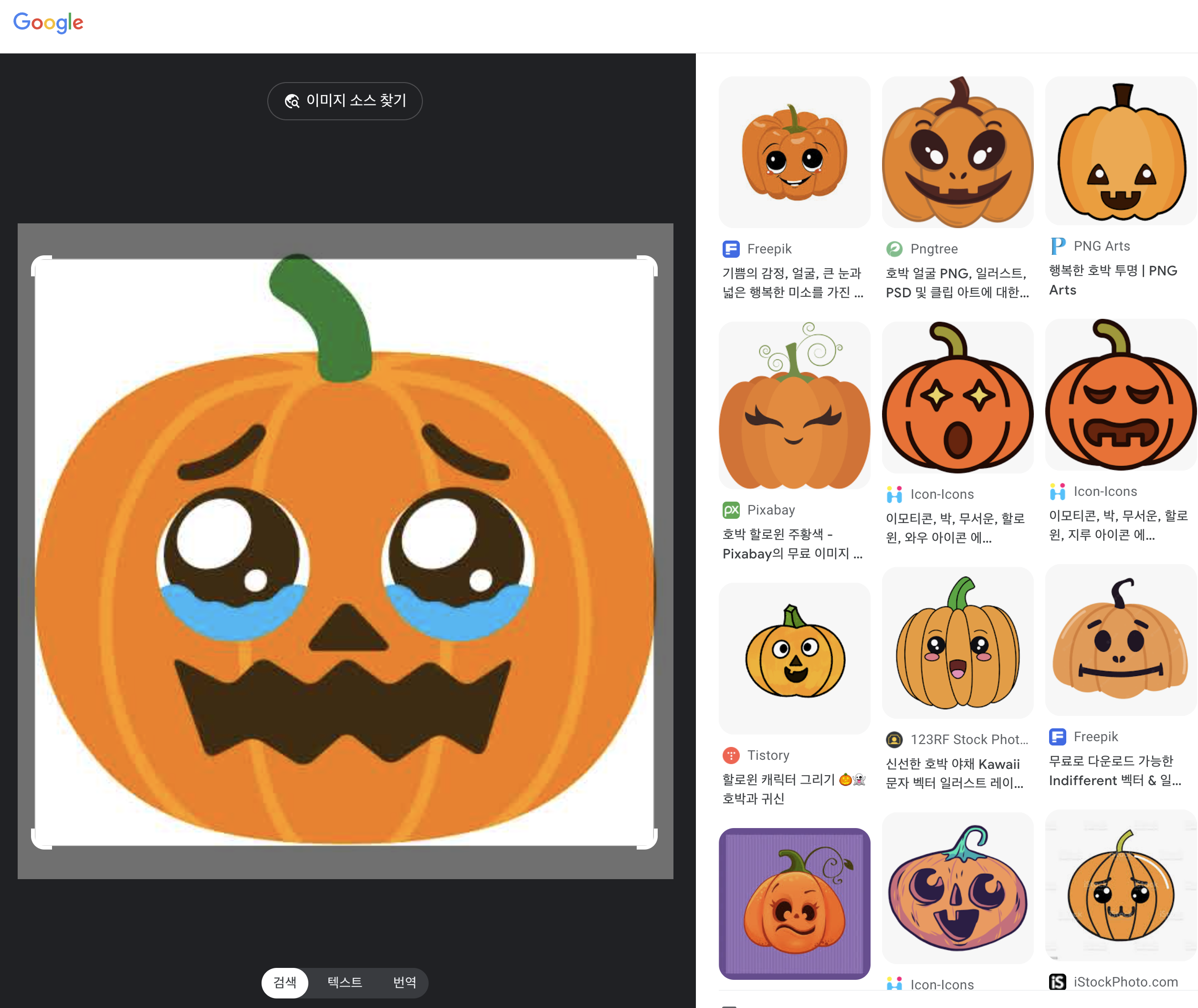 울고 있는 호박 모양의 이모지를 검색창에 드래그 앤드 드롭하였더니 이미지 검색이 되어서 비슷한 이미지들을 표시해줍니다.
