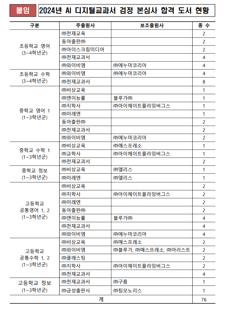 이번 검정심사에서는 총 146종의 교과서 중 76종이 최종 합격했습니다. 주요 도입 계획은 다음과 같습니다: